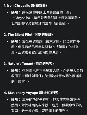 從 Claude 3.0 開始用到 Gemini 3.0,我都會丟照片請 AI 用隱喻方式幫照片命名,有時候會請他不要直接分析景象上的物件,而是用輪廓來抽象化想像,這個景象影射了什麼。