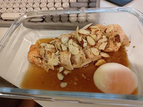 照燒醬醃漬舒肥雞胸肉,舒肥溫泉蛋,佐杏仁片,香草鹽巴...