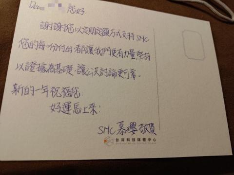 圖為去年捐款,收到的手寫感謝卡